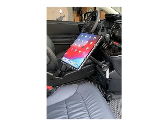 Support voiture universel pour tablette avec fixation sur le rail du siège passager. Hauteur et orientation ajustables. Livré avec deux tailles de support tablette et kit de fixation (outils non fournis). Compatible toutes tablettes.