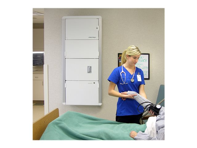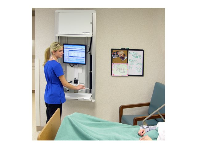 Station de travail sûre, complète et compacte. Idéal pour les chambres dont l'espace est réduit, ce système d'ajustement vertical discret propose un ajustement sans effort de 23 cm et se replie en une unité mince et compacte lorsqu'il n'est pas utilisé. Son mécanisme de verrouillage sans clé permet de protéger les données du patient et d'ainsi respecter les exigences en termes de confidentialité.