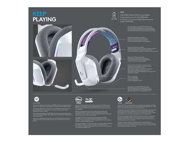 LIGHTSYNC RGB, pilote Pro-G, Blue VO!CE Mic Technology, technologie sans fil LIGHTSPEED
