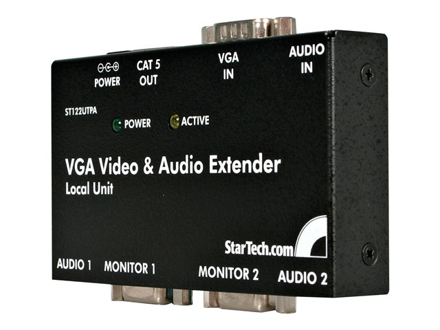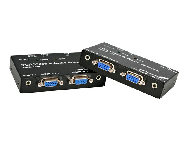 L'extendeur vidéo VGA sur Cat 5 avec audio ST122UTPAEU permet la connexion d'au plus 4 moniteurs (2 locaux et 2 distants) sur un seul PC. Le signal vidéo et l'audio correspondant sont envoyés à une unité distante via un câble 4 paires standard de catégorie 5 ou supérieur (Cat 5e recommandé), prenant en charge des distances vidéo d'au plus 150 mètres.